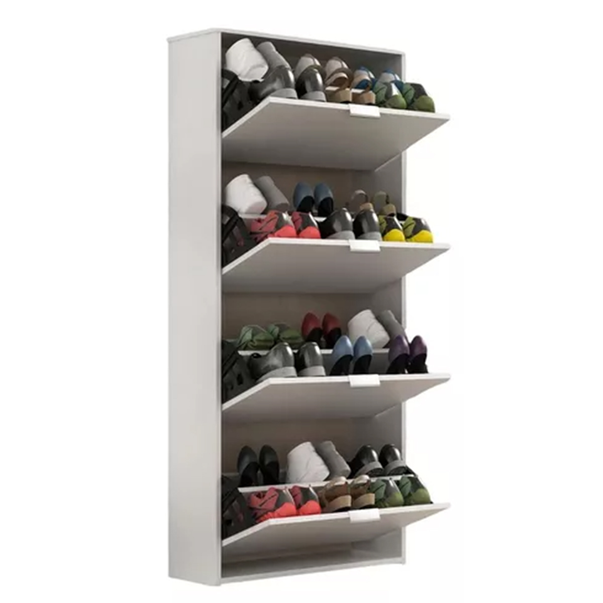 Chega de bagunça de sapatos! A Sapateira Basculante Organizadora é a solução definitiva para manter seus calçados em ordem e de fácil acesso. Com quatro portas basculantes, ela pode acomodar até 24 pares de tênis, sapatos ou sandálias de até o tamanho 41. Além disso, sua construção em painel aglomerado MDP oferece a estabilidade necessária para se encaixar perfeitamente em qualquer espaço da sua casa. O acabamento em pintura UV de alto brilho dá um toque lustroso à sapateira, enquanto os quatro puxadores em ABS resistem a impactos.